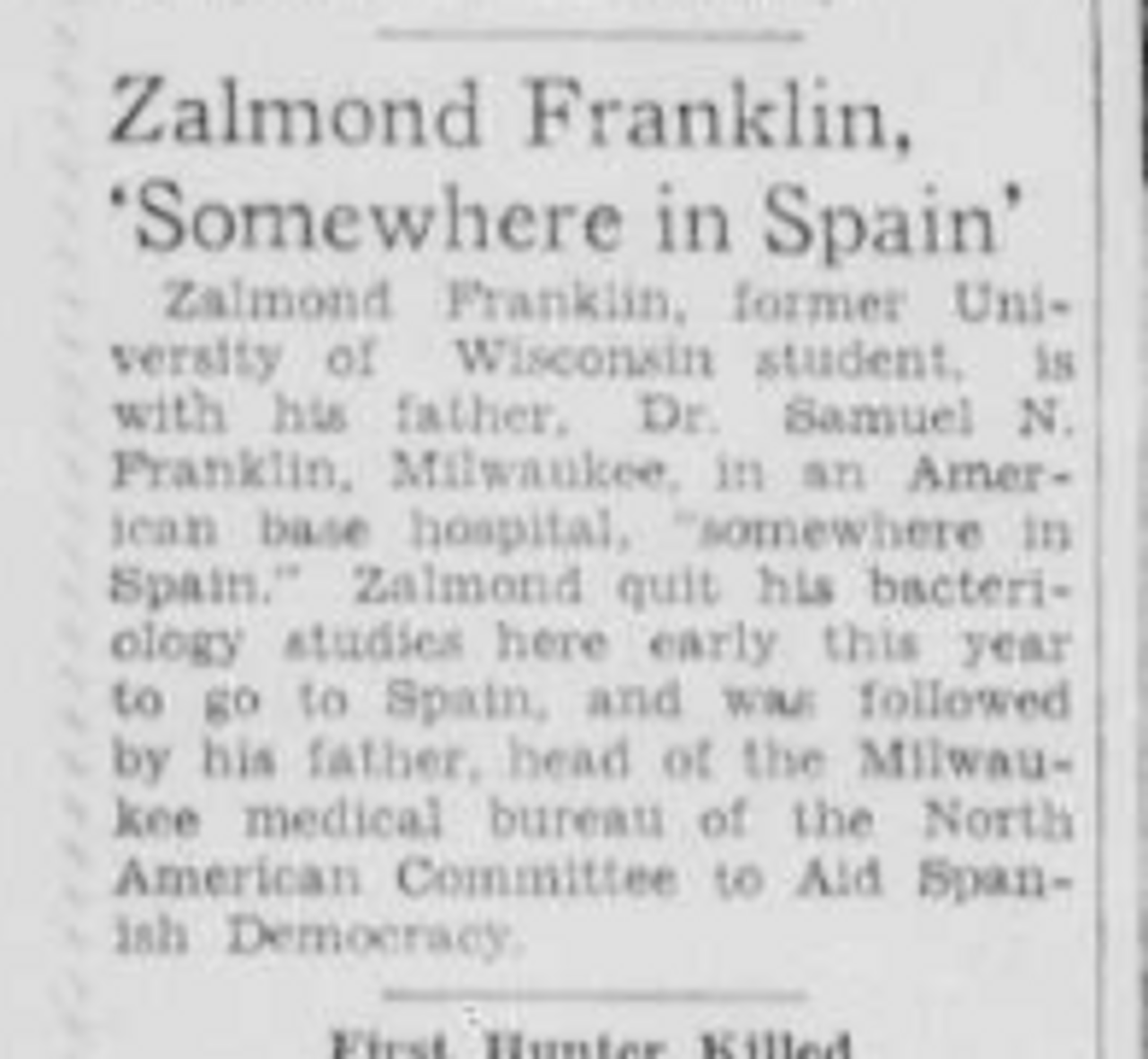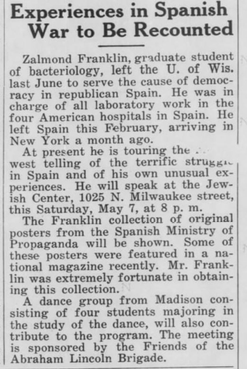 [28] “Zalmond Franklin, ‘Somewhere in Spain,’” October 11, 1937, Wisconsin State Journal, p. 2.