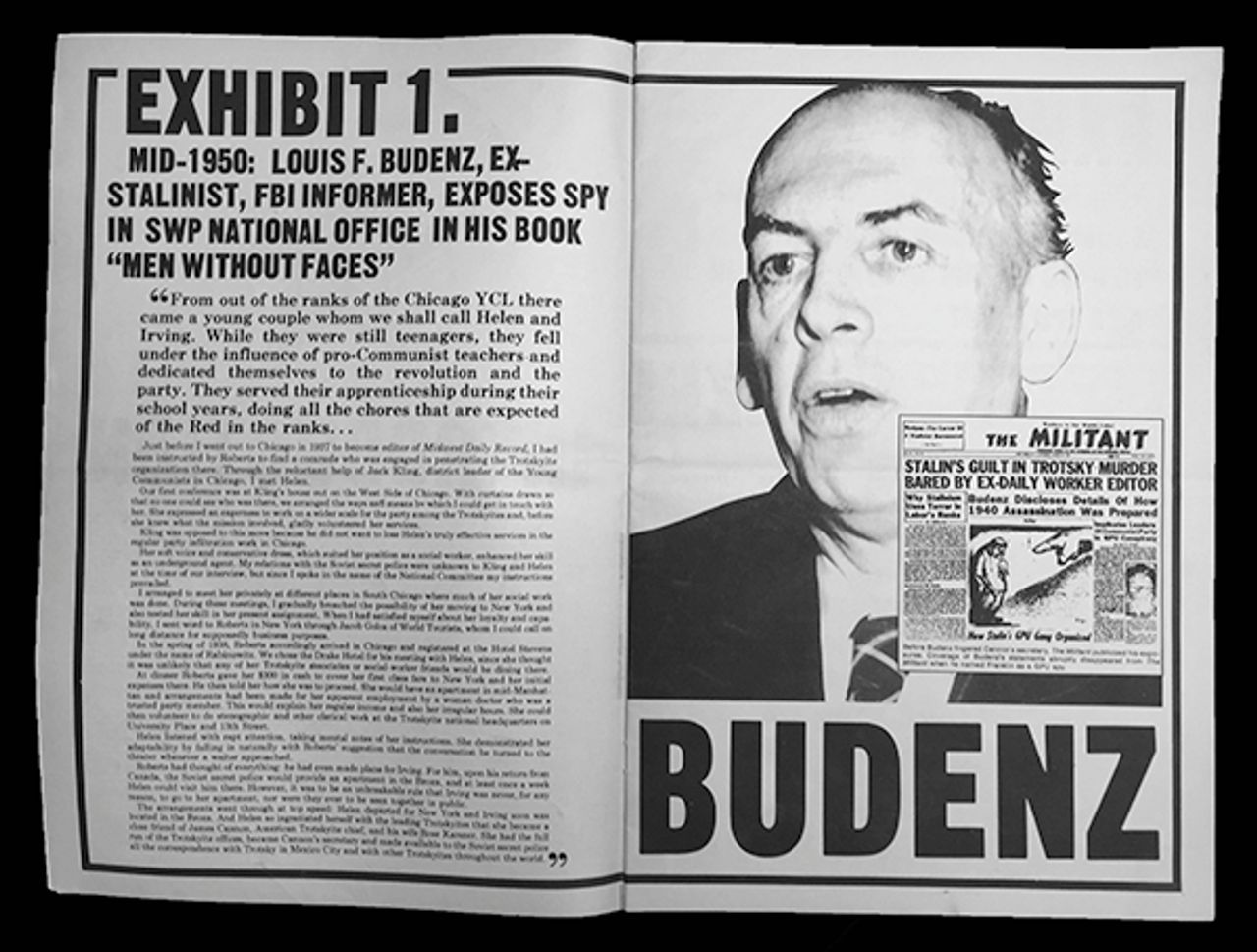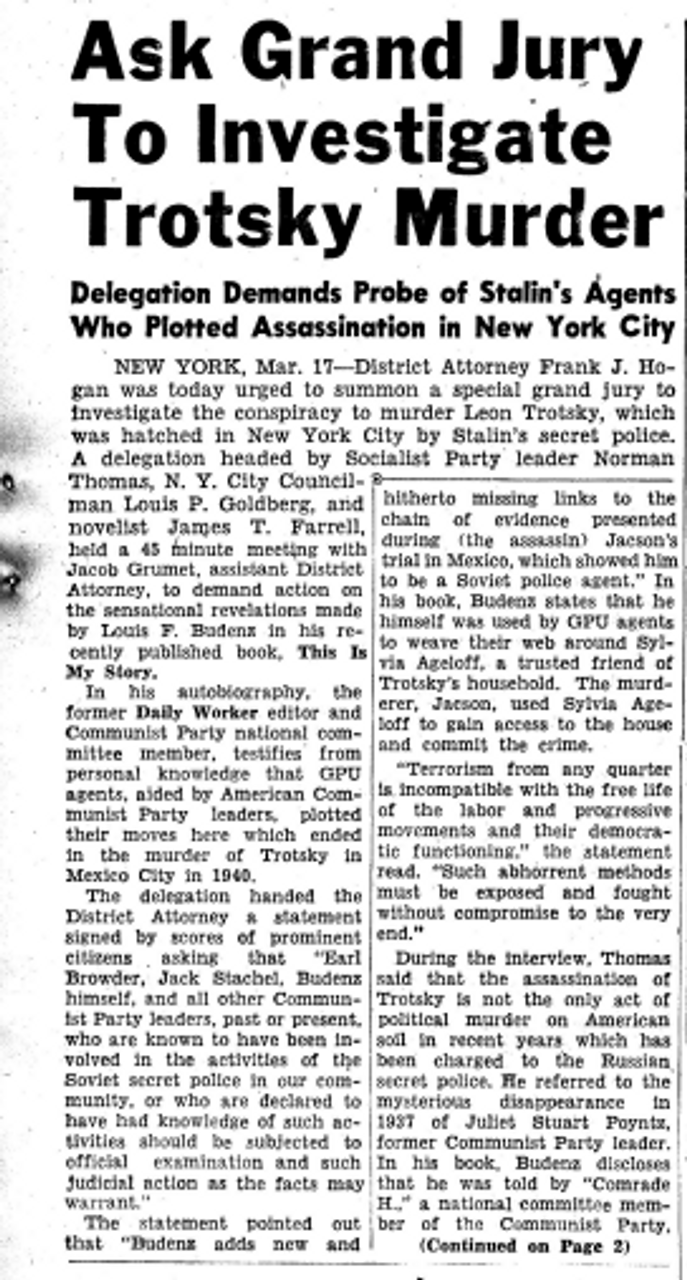 “Stalin’s guilt in Trotsky murder bared by ex-Daily Worker editor: Budenz discloses details of how 1940 assassination was prepared, implicates leaders of Communist Party in GPU conspiracy.” [1]