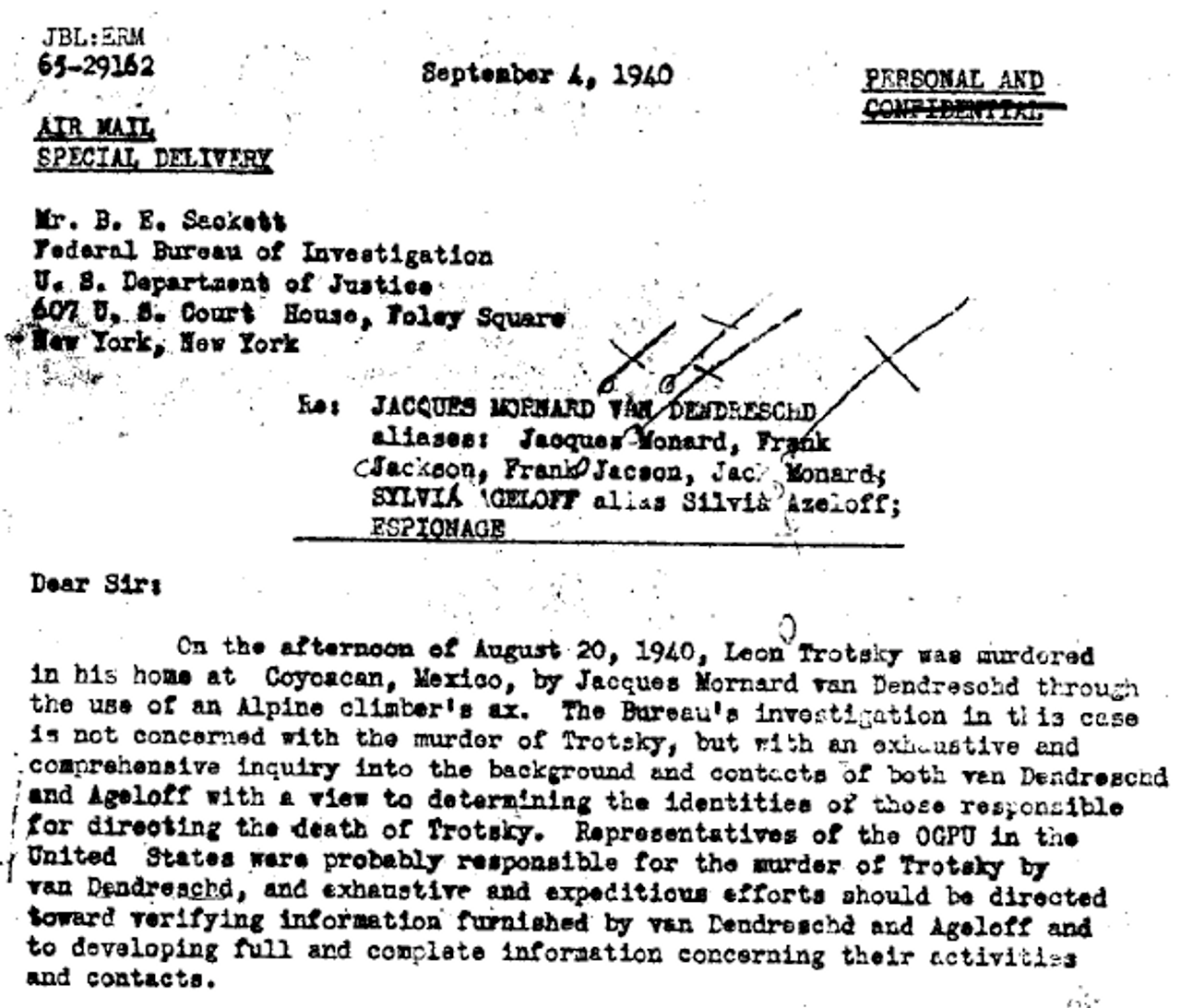 Upon his arrest, Jacson-Mornard’s immediate response to questioning was to deny any connection to the GPU and claim he was a disgruntled Trotskyist who attacked Trotsky when the latter opposed his marriage to Ageloff. Again, Sylvia’s name appears at the center of his lie.