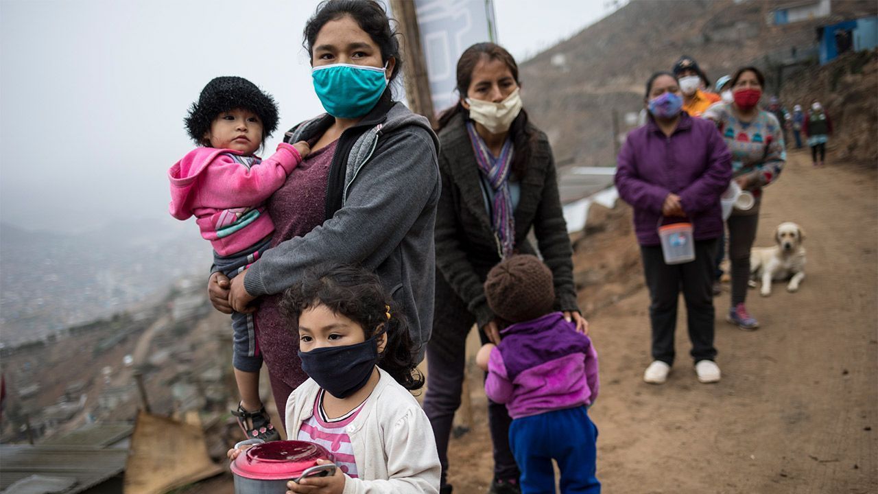 Families wait in a line for a free meal in Lima, Peru, June 17, 2020. (AP Photo/Rodrigo Abd)
