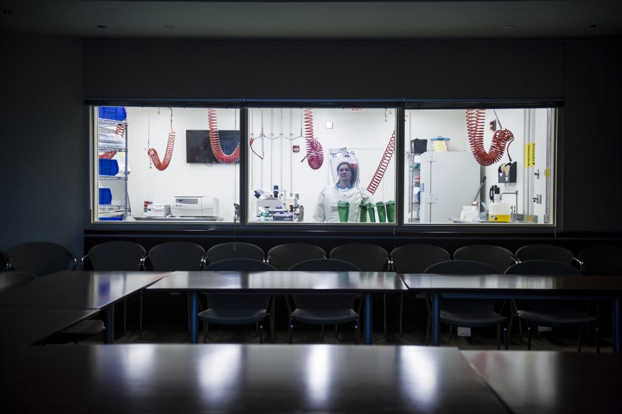 Scientists in the National Emerging Infectious Disease Laboratories at Boston University. [Photo: Tim Llewellyn for Boston University Photography.]
