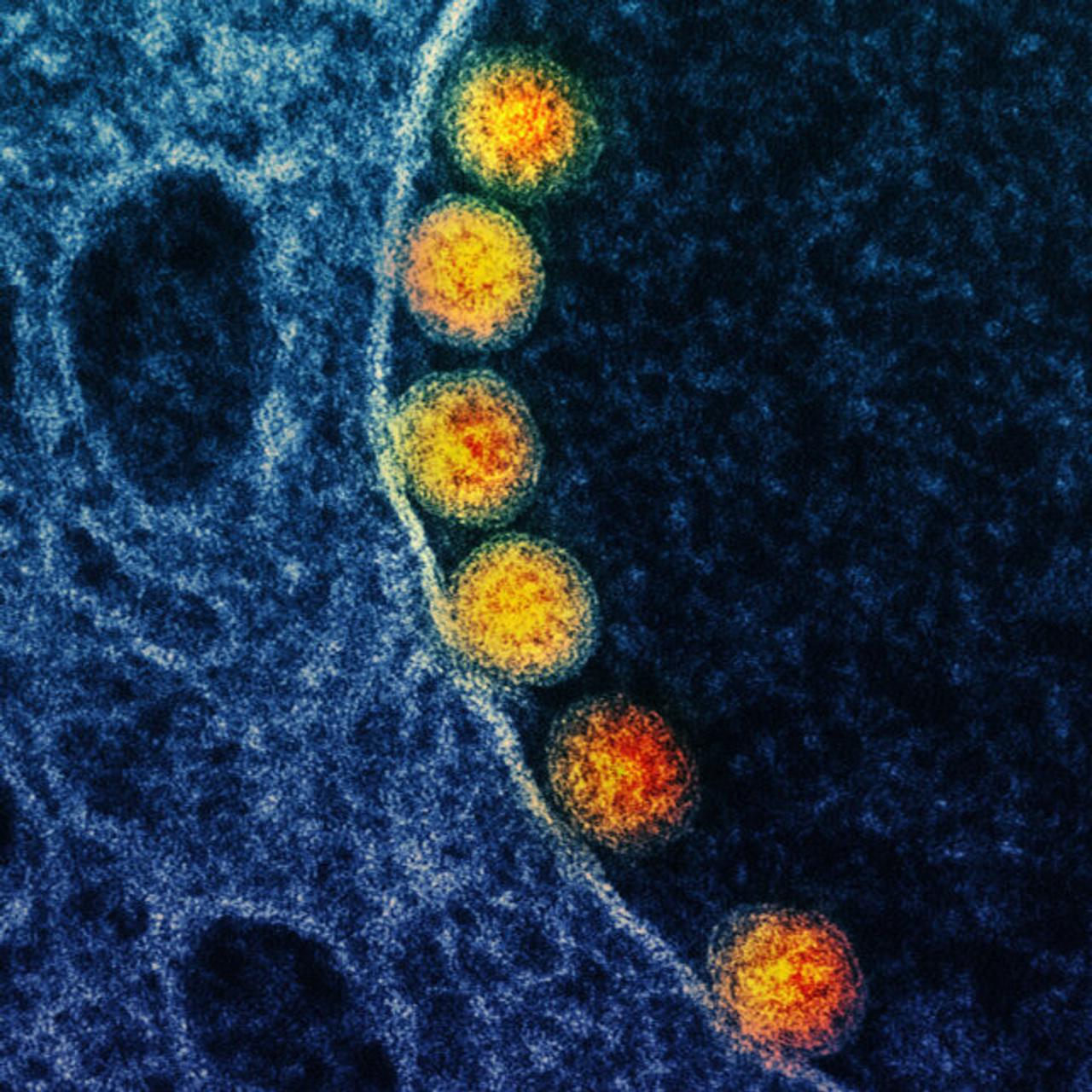 Transmission electron micrograph of SARS-CoV-2 virus particles (gold), from an infected nose. [Photo: NIAID]