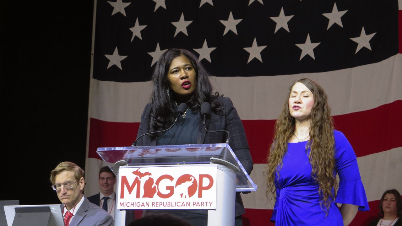 Kristina Karamo speaks to Michigan Republican Party delegates Saturday, February 18, 2023, in Lansing, Mich. Karamo, who was overwhelmingly defeated in her bid to become Michigan’s secretary of state, was chosen Saturday to lead the state's Republican Party for the next two years. [AP Photo/Joey Cappelletti]