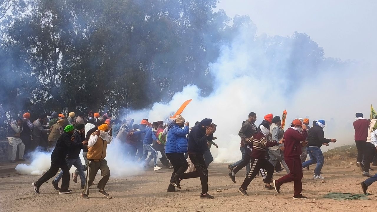 Farmers run for cover after police fired tear gas to disperse protesting farmers who were marching to New Delhi near the Punjab-Haryana border at Shambhu, India, Tuesday, Feb.13, 2024. [AP Photo/Rajesh Sachar]