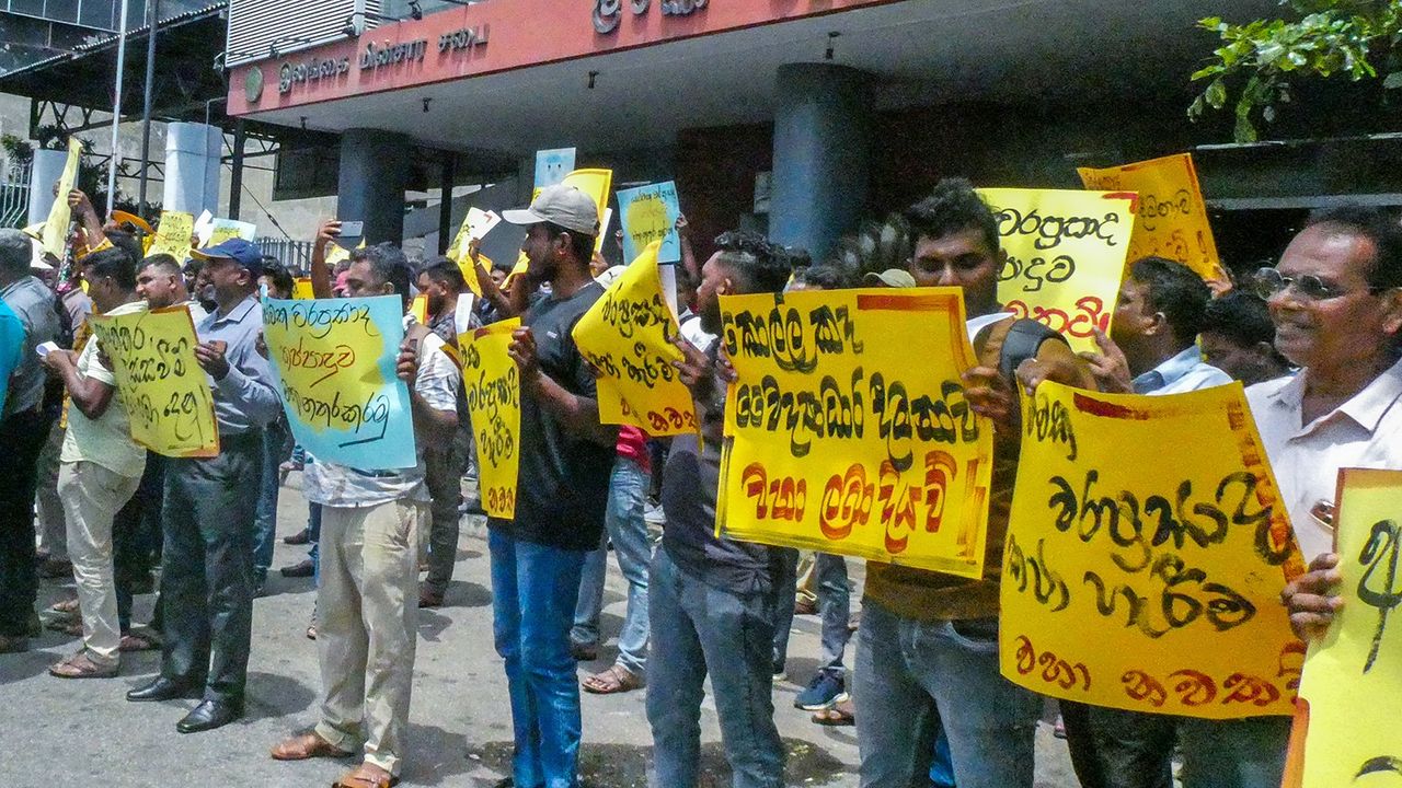 22 ஜூலை 2025 அன்று கொழும்பில் உள்ள இ.மி.ச. தலைமையகத்திற்கு வெளியே மின்சார ஊழியர்கள் ஆர்ப்பாட்டம் நடத்திய போது.